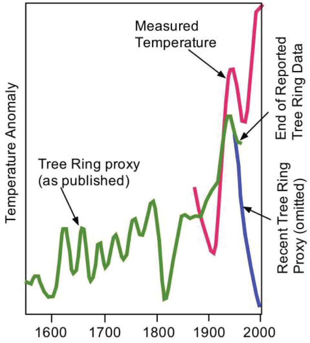 The apparent goal was to preserve the hockey stick, which was felt to be necessary to show that rising greenhouse gases in the 20th century was the unique cause of continuously rising temperatures. The “solution” to the problem of this “divergence” [of tree ring data from reality] was “the trick” (as stated by one of the climatologists) of not showing the down trending proxy data in the late 20th century, and replacing it with measured temperatures that were rising. A hacked email by Phil Jones said:
