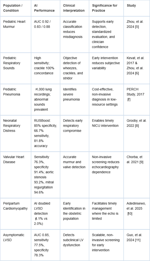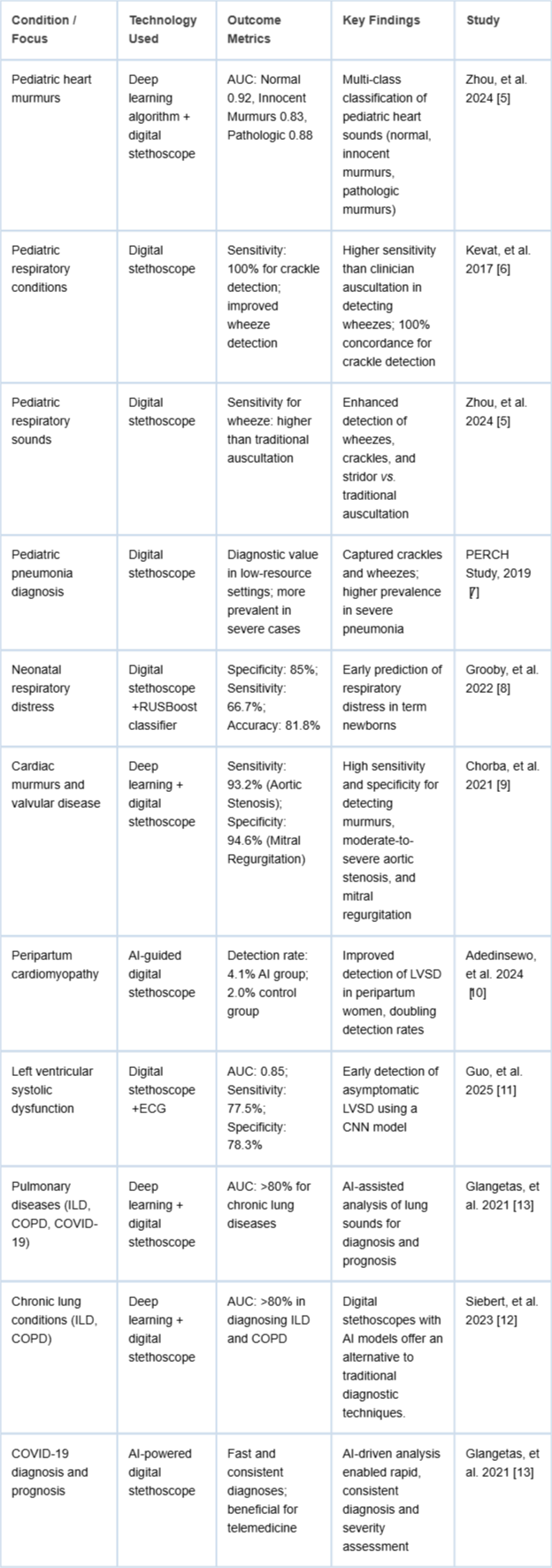 AI-integrated digital stethoscopes represent a transformative advancement in evidence-based clinical practice. They enhance diagnostic accuracy, reduce inter-observer variability, and facilitate early detection of cardiac, pulmonary, and neonatal conditions. Recent studies highlight their utility in pediatric heart murmur classification, neonatal respiratory distress, peripartum cardiomyopathy, chronic lung disease, and COVID-19 management.