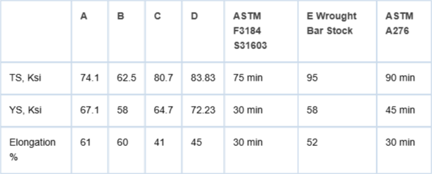 The wrought and AM 316L rods' chemical composition was compatible. The wrought rods were taken off the shelf and were in the annealed condition. The AM rods post-processing was performed in-house for a similar anneal (in the stress-relieved condition for 400 oC for 1 hour).